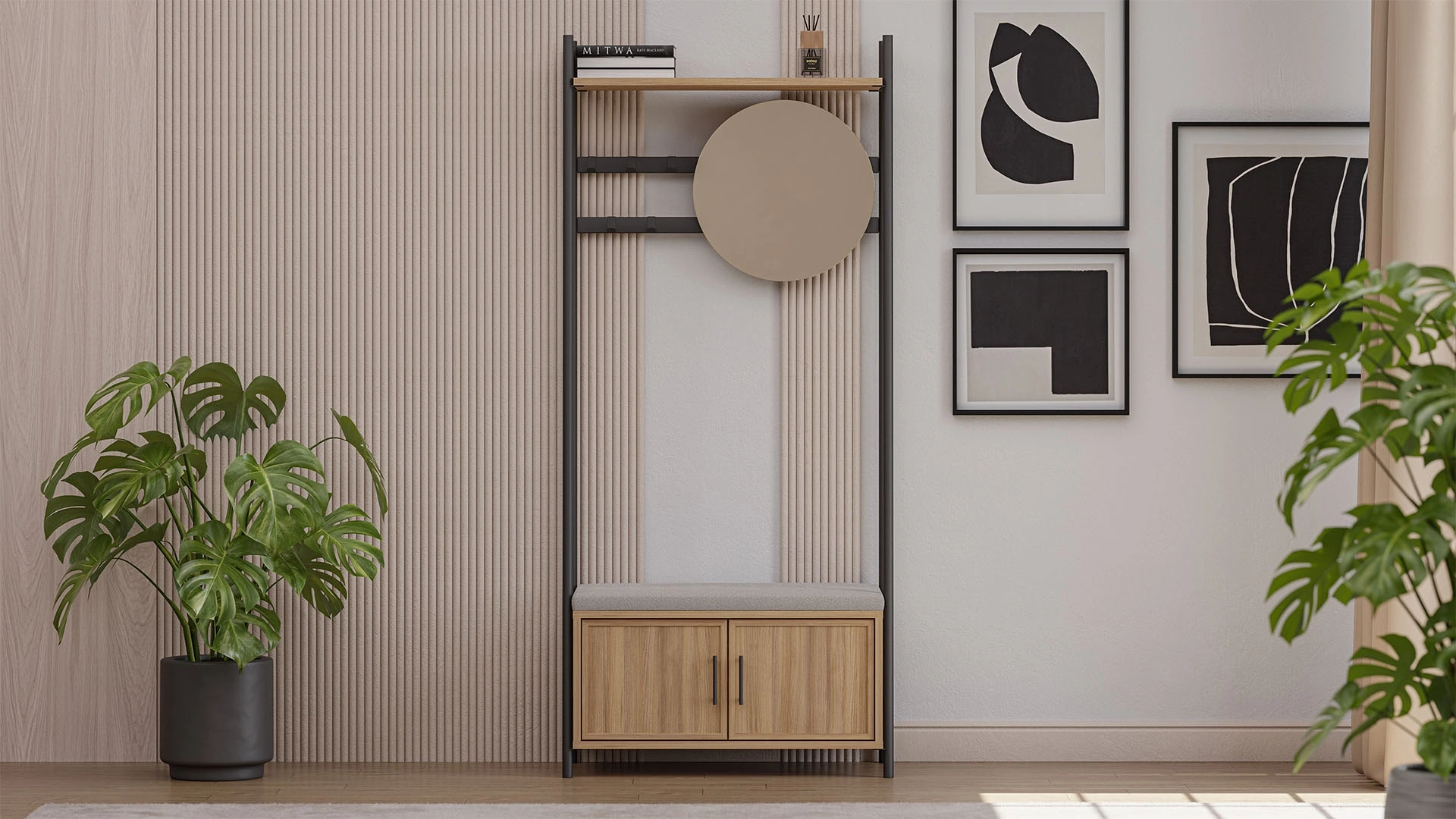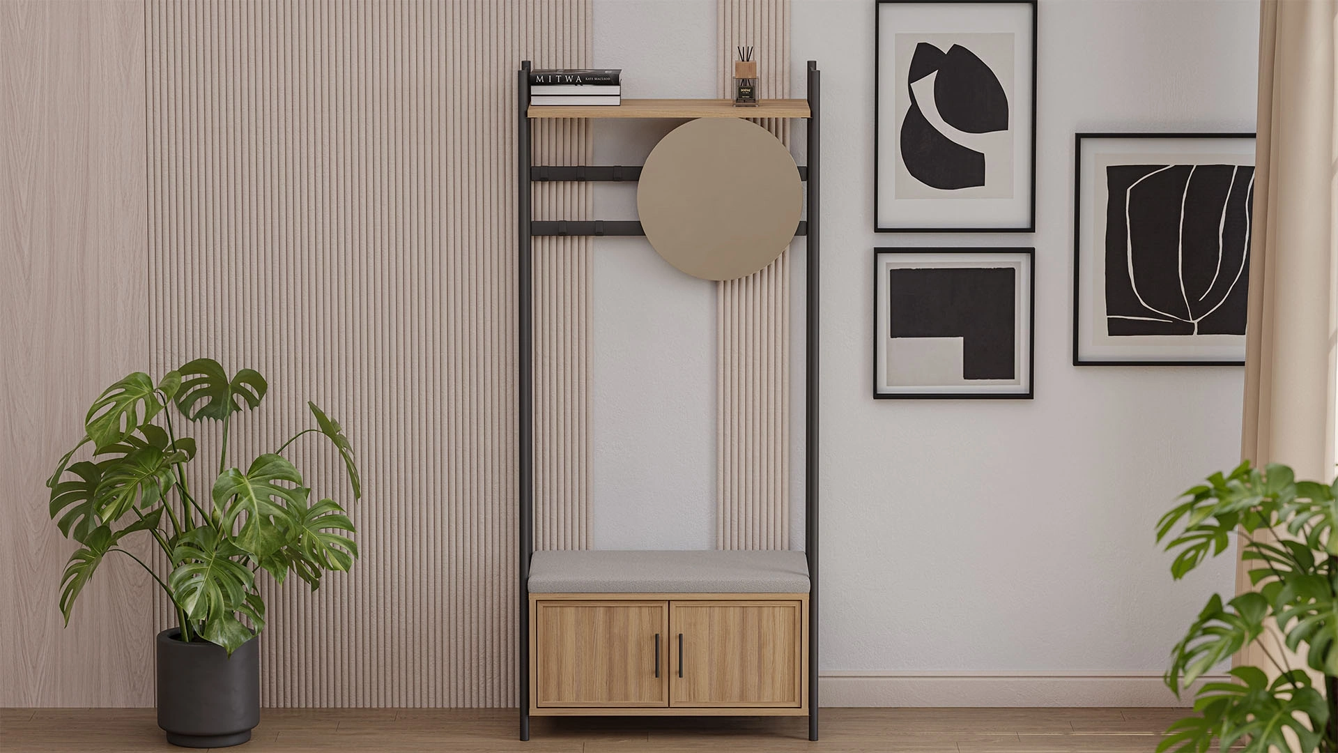 Glen Tortana Portmanto, antrenizi düzenliyor ve güzelleştiriyor. Modern ve sıcak bir tasarıma sahip olan bu portmanto, meşe renginin doğallığı ile siyah metal detaylardan meydana geliyor. Alt kısmındaki dolap, ayakkabılarınızı ve diğer eşyalarınızı saklamak için harika bir alan. Üst raf, dekoratif eşyalar veya dışarıdan geldiğinizde çantanızı bırakmak için uygun yer sağlıyor. Askılık bölümüne de kabanlarınızı ve şapkanızı asabilirsiniz. Glen Tortana Portmanto, misafirlerinizi sıcak şekilde karşılamanın en güzel yolu.