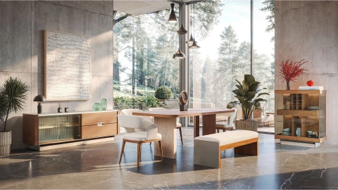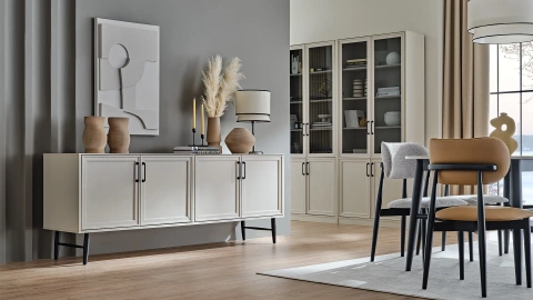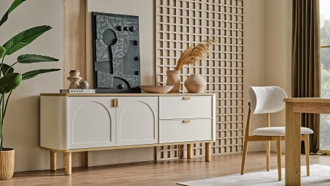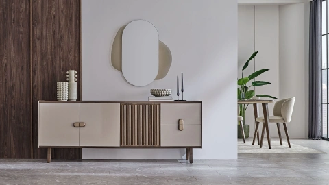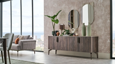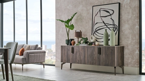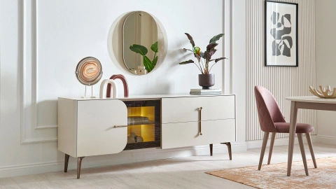 Çekmeceli yemek odası konsol modelleri en özel gümüş çatal bıçak takımlarınızı saklamak adına gümüşlük olarak kullanılabilir. Bunun yanı sıra peçete, masa örtüsü gibi yemek masası düzeni için gerekli parçaları da çekmeceli konsollarda saklayarak ihtiyaç duyduğunuzda kullanıma hazır bir şekilde, rahatça bulabilirsiniz. Öte yandan, geniş hazneli dolaplara sahip konsollar, porselen yemek takımlarınızı ve fincan takımlarınızı güvenli bir şekilde muhafaza etmek için ideal bir alan oluşturur.