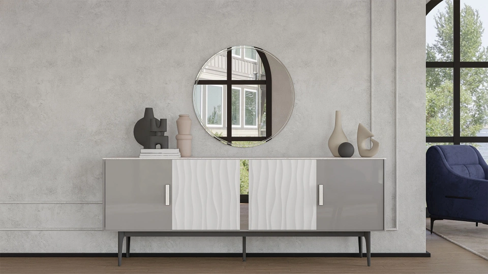 Modern ve lüks stil koleksiyon oluşturmak için tasarladığımız Nita Koleksiyonu, minimalist bir yaklaşımla birleştirilmiş temiz hatlar, kaliteli ve dokusunu hissedebildiğimiz dekorları ve dikkat çekici detaylarıyla karakterize edilmiştir. Tasarımda dikkat çekici alanlar belirlenerek, sade ve kullanışlılığın ön planda olması beklenmektedir. Parlak laminasyona sahip sunta lam dekoru, doğal taş dokusuna sahip dekorla kullanılmıştır. Füme renk metal detaylı ayakları koleksiyona güçlü duruş etkisi sağlamaktadır. Koleksiyonda füme ayna, nötr ve yumuşak tonlar, beyaz, bej, gri ve füme renkler kullanılmıştır. Bu özelliklerin kombinasyonuyla, modern ve lüks koleksiyon tasarımı ortaya çıkmıştır.Nita Koleksiyonu modern yapısının yanında iddialı duruşun bir simgesi.  Gövdedeki sedefli gri renk ve füme ayna ürüne parıltı ve yansıma sağlarken, organik formlu kapaklar ile özgün doku ve renklerin uyumunu yakalıyor. Adeta bir kanyonu anımsatan üç boyutlu kapaklarıyla doğanın gücünü hissettiren benzersiz bir koleksiyon. Zarif metal ayaklar ve metal çerçeveli mermer kulpları ise koleksiyonu tamamlayan eşsiz detaylardandır.