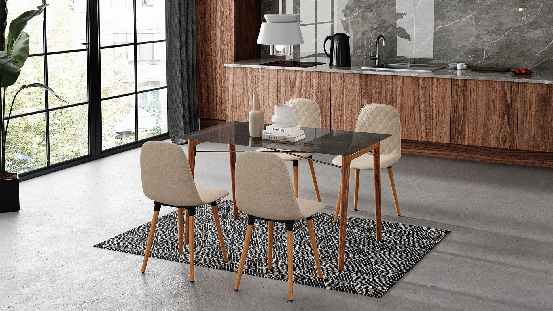Plato mutfak masası, cam ve ahşabın bir araya geldiği özel tasarımı ile mutfak dekorasyonunuza bambaşka bir tarz kazandırıyor. Ahşap ayakları ve koyu renkli cam üst yüzeyi ile görünümünü tamamlayan ürünü Plato sandalyeler ile tamamlayabilirsiniz.