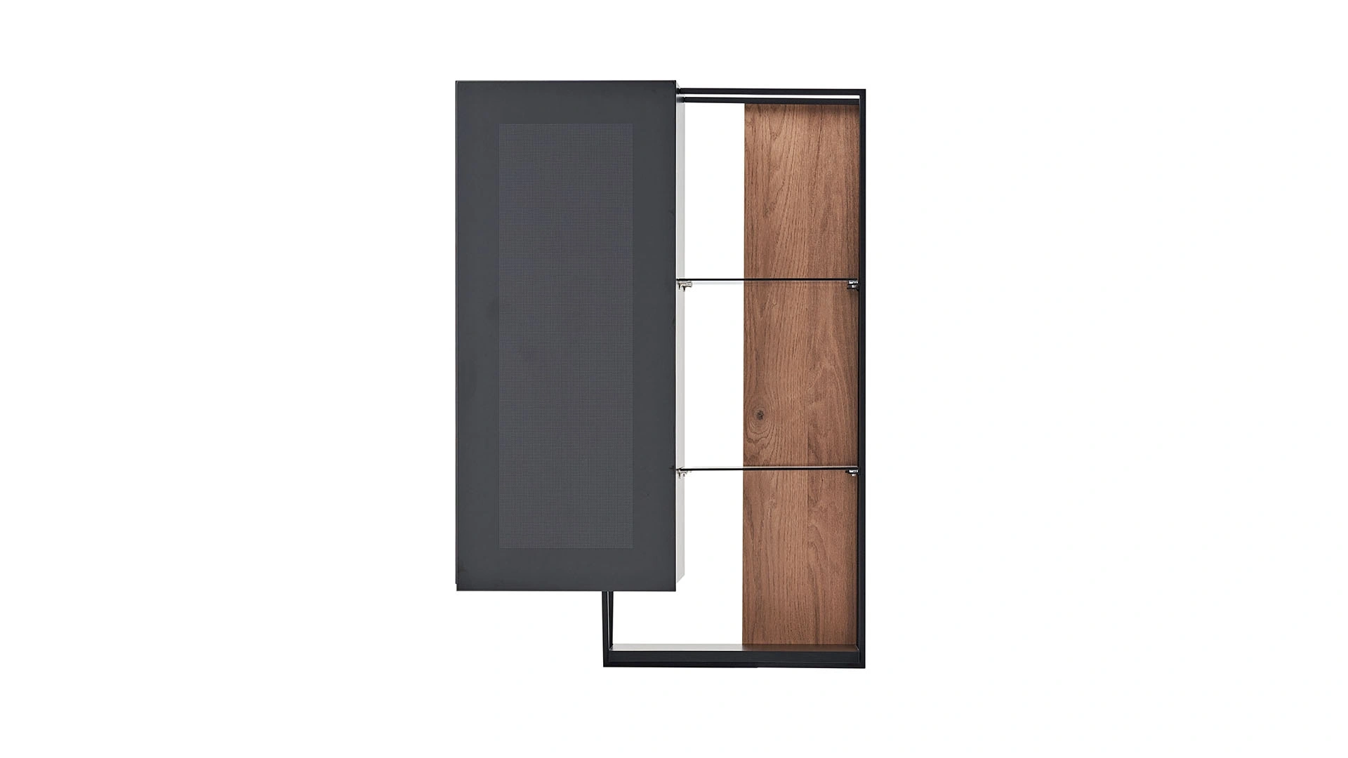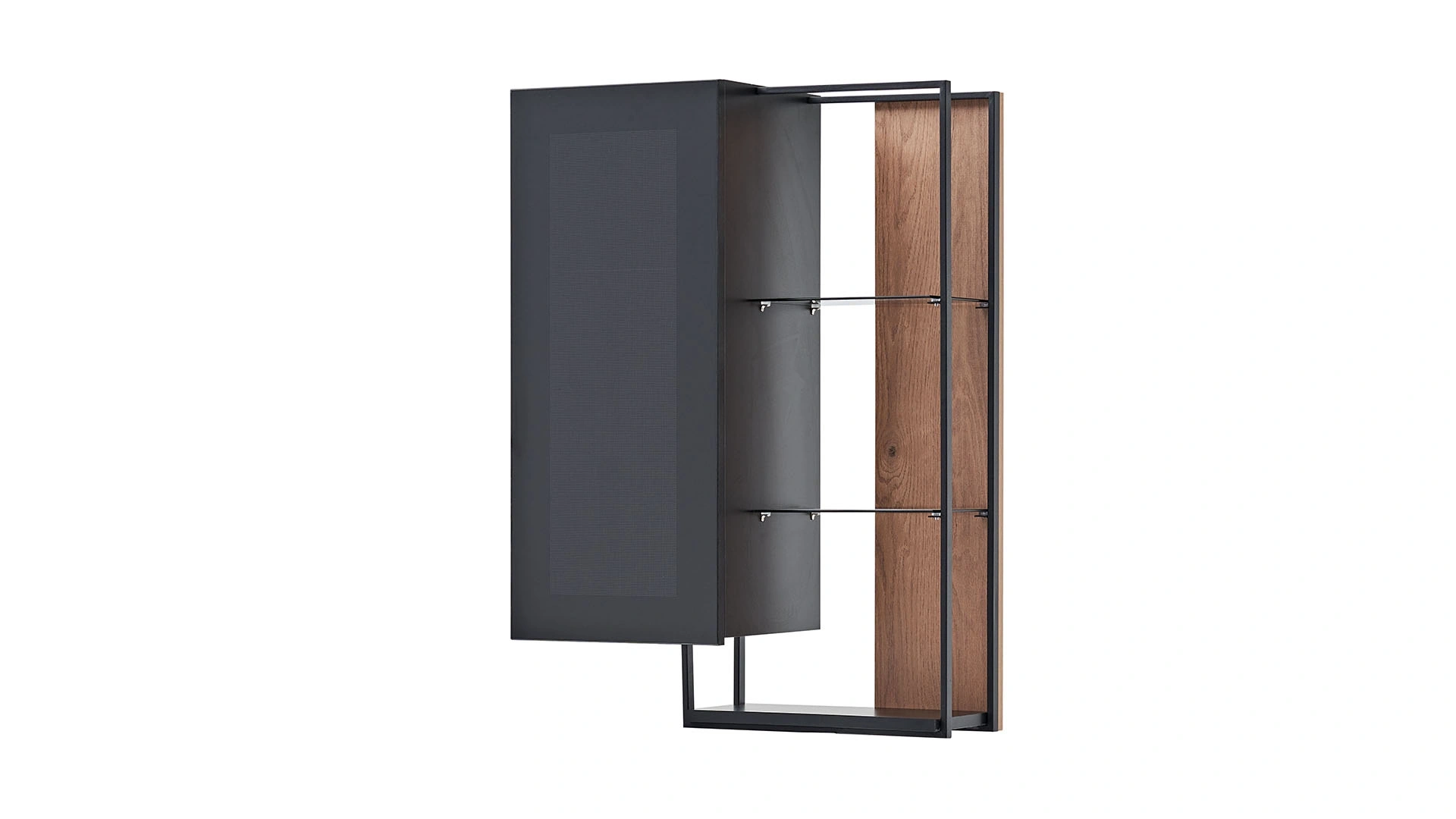 Solid TV ünitesinin üst yan modülü, siyah metalin ön planda olduğu görünümü ile modern bir dekorasyon oluşturmak isteyenlerin beğenisini kazanıyor. Kafesli, siyah bir dolap alanı bulunan üst modülde üç açık raftan oluşan bir sergileme alanı da yer alıyor. Solid TV ünitesini tamamlamak için siz de üst yan modülü satın alabilirsiniz.