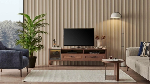 Vermont TV Ünitesi Alt Modülü, 173 cm genişliğiyle hem kompakt hem de kullanışlı bir çözüm. Ceviz rengi ahşap gövdesi ve sol tarafta yer alan siyah kapak tasarımıyla hareketli bir tarz sunan bu TV ünitesi, yaşam alanınızın dekoruna kolayca uyum sağlıyor. Alt bölümde yer alan geniş çekmeceleri ve açık raf alanını ister dekoratif aksesuarlar yerleştirmek için isterseniz de depolama amacıyla kullanabilirsiniz. Ürün, yerden yüksek ayak tasarımıyla ise temizliği büyük ölçüde kolaylaştırıyor.